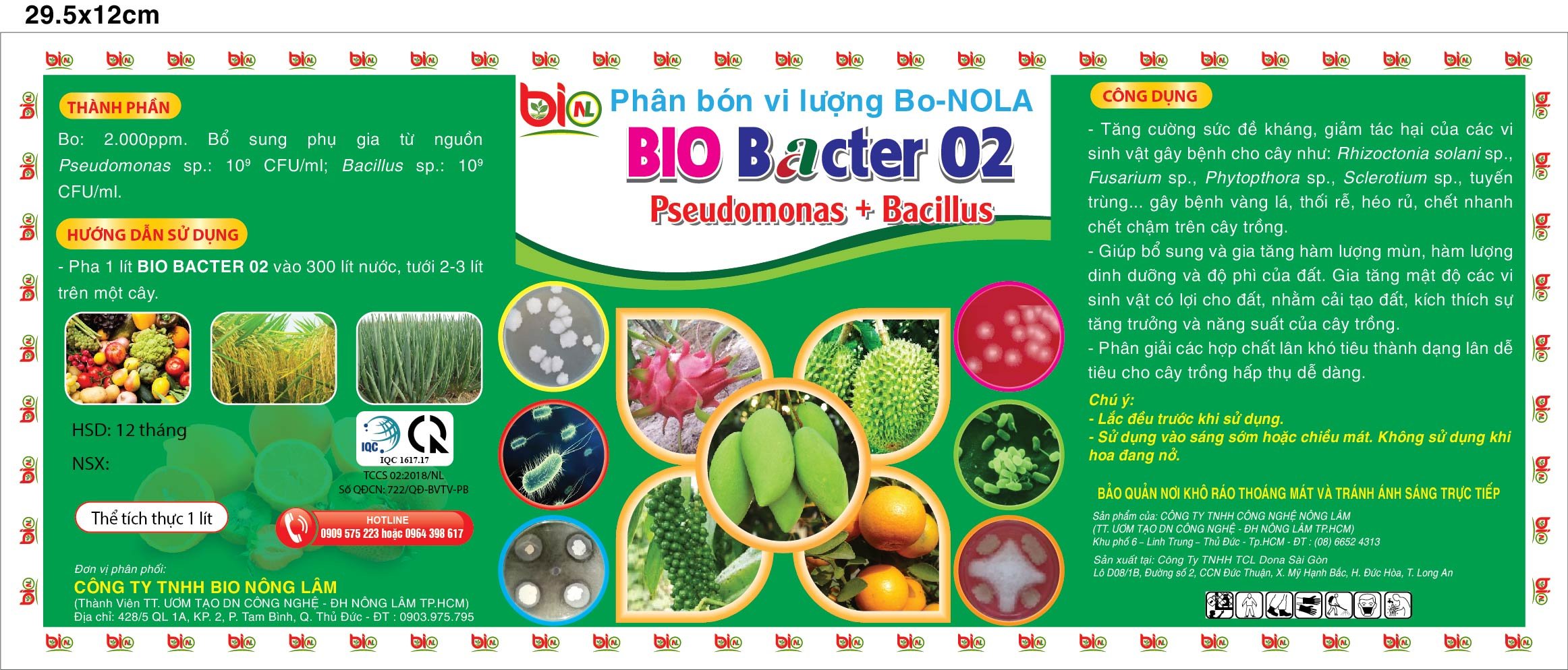 BIO BACTER 02 là sản phẩm gồm các chủng vi khuẩn Bacillus, Pseudomonas có vai trò trong đề kháng, phòng một số bệnh trên cây trồng như thán thư, thối nhũng, đốm lá, đốm quả...