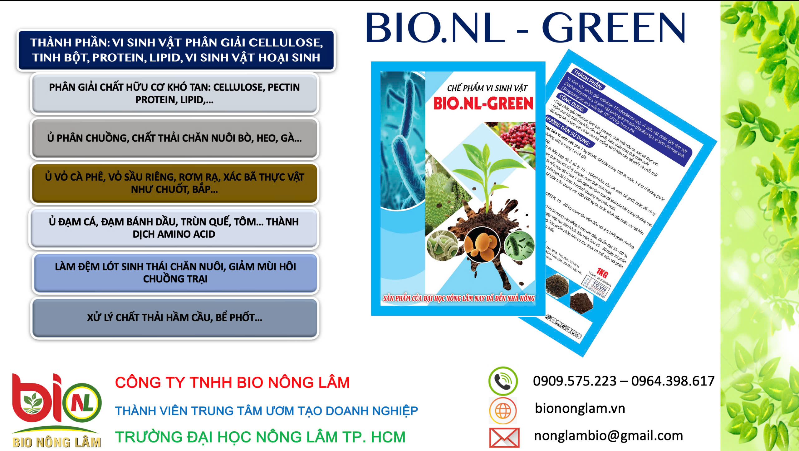 BIO GREEN là tập hợp các chủng vi sinh vật có lợi cho canh tác nông nghiệp như: Trichoderma, Bacillus, Pseudomonas, xạ khuẩn, vi khuẩn cố định đạm, phân giải lân, phân giải kali...