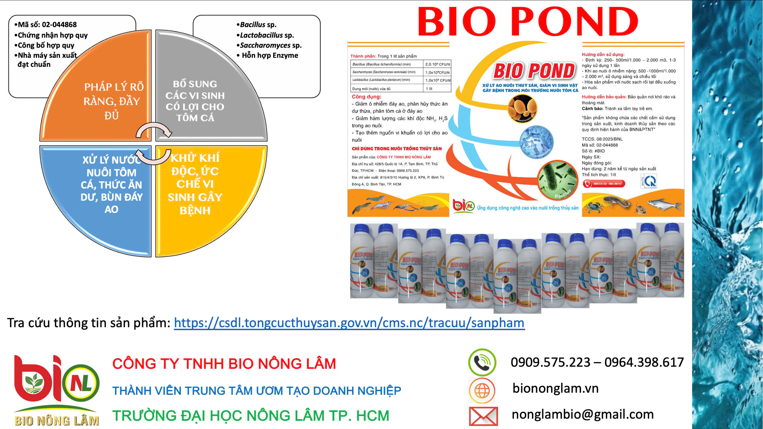 BIO POND là sản phẩm chứa các vi sinh vật có lợi như Bacillus, Lactobacillus, nấm men giúp phân giải các hợp chất hữu cơ, thức ăn dư thừa, làm sạch môi trường nuôi trồng thuỷ sản. Giảm các loại khí độc như H2S, NH3, SO2...